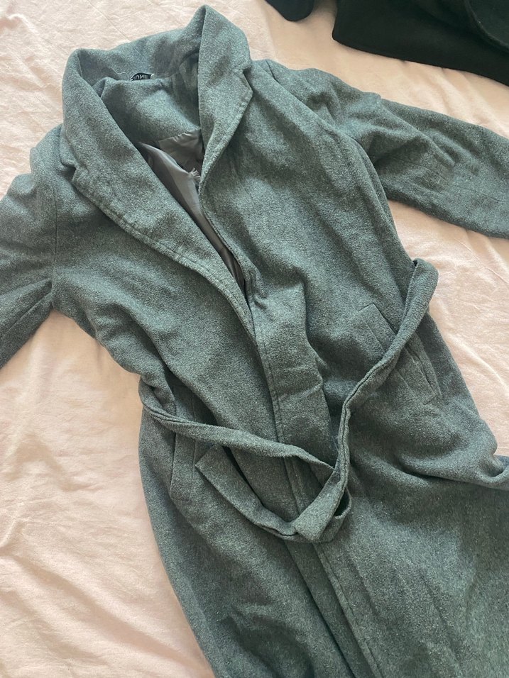 Kuşaklı ve klasik yakalı antrasit renk kaban, şık ve zamansız bir görünüm sunar. iç astarında sökük var o yüzden uygun tutuyorum