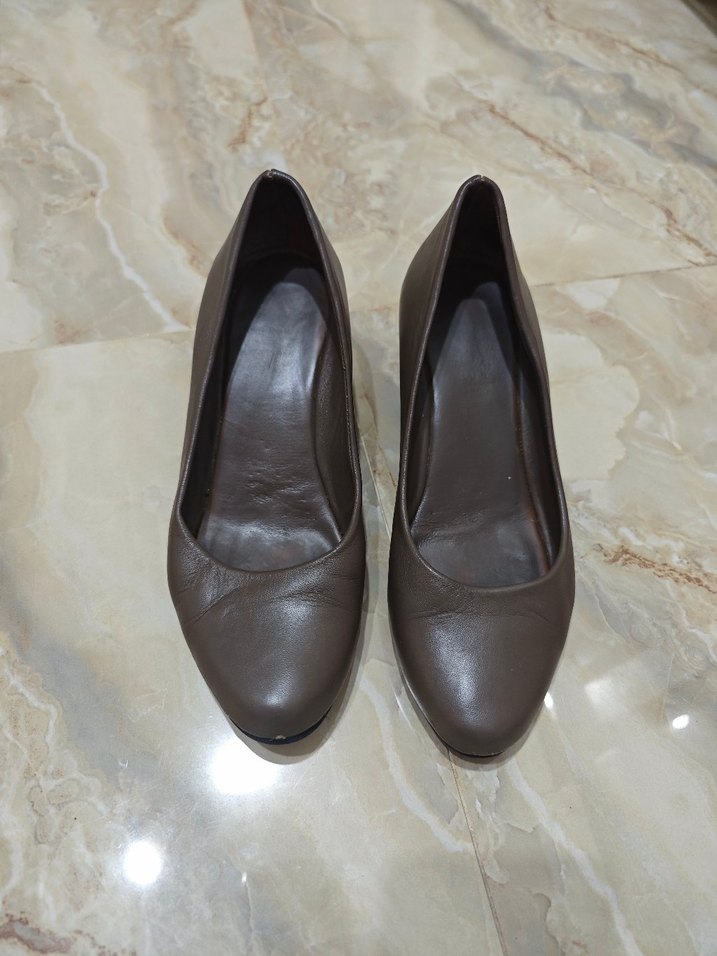 Bej renk, dolgu topuklu, kauçuk malzemeden yapılmış kadın klasik ayakkabı, minimalist ve geleneksel tarzda, ofis için uygun.