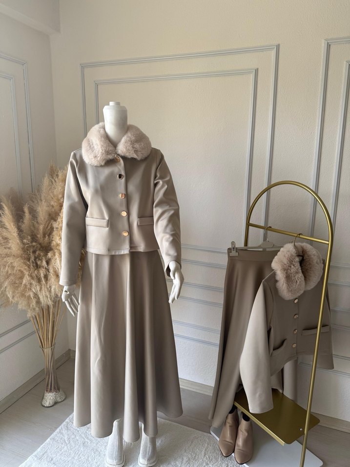 Bu kadın takımı, yumuşak kürk detaylı bej uzun etek ve ceket ile modern klasik tasarıma sahiptir. Normal kesim, yaka detaylı ve uzun kolludur. Ofis için uygundur.