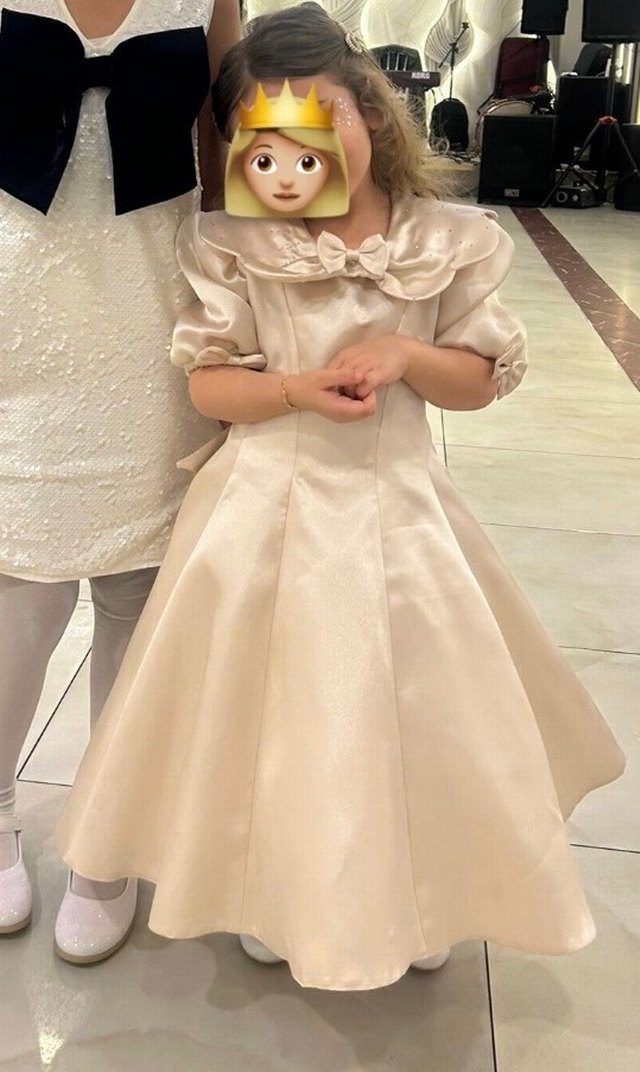 Parlak bej saten kumaştan, yakalı ve kısa kollu, oturan kesim kız çocuk elbisesi. Kol dikişlerde hafif bir aşınma var ama çok hafif düzeyde sıkıntı olmaz fiyatı ona göre koyacağım ufak bir pazarlık mevcut elbise boy 76 cm giyen çocuk 4 buçuk yaşında 5-6 yaşa uygun