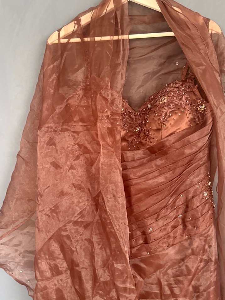 V yaka, kolsuz ve drapeli tasarıma sahip, klasik bej renkli uzun abiye elbise. Parlak kumaşı ve vintage detaylarıyla bohem tarzda, düğünler için uygun.