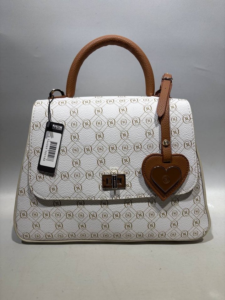 Beyaz deri, baskılı desene sahip modern klasik tarzda kadın çanta. Tokalı detaylar ve kalp şeklinde aksesuar içerir, günlük kullanım için uygundur.