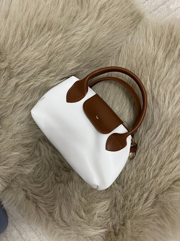 Minimalist beyaz deri çanta, kahverengi saplı. Modern klasik tarzıyla günlük kullanıma uygundur.