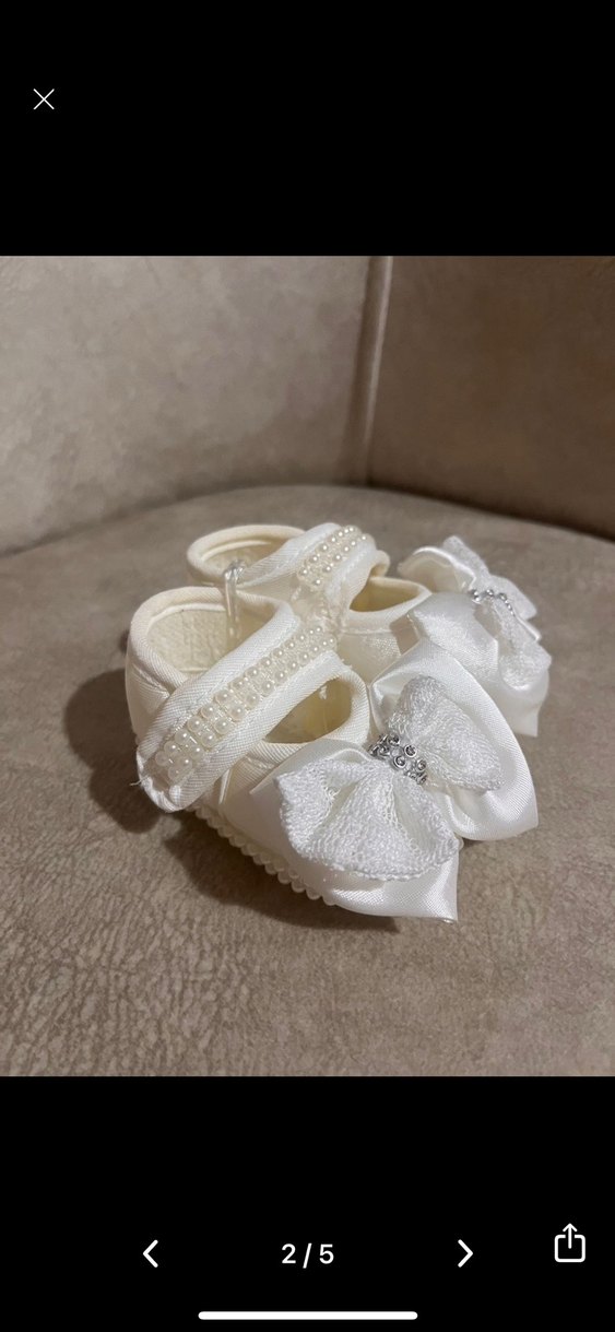 Beyaz renkli, işlemeli fiyonk ve inci detaylı, yumuşak kauçuk tabanlı klasik şıklıkta kız çocuk özel ayakkabısı.