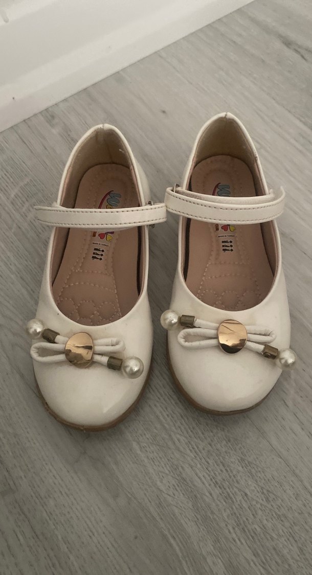 Kız çocukları için beyaz, tokalı babet ayakkabılar. Modern klasik tasarıma sahip, lastik malzemeden üretilmiş, desensiz ve fiyonk detaylı.