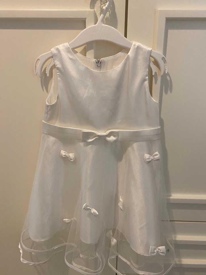 Kolsuz, beyaz kız çocuk elbisesi, fitted kesim ve zarif fiyonk detaylarıyla modern klasik tarzda, yumuşak sentetik kumaş kullanılmıştır.