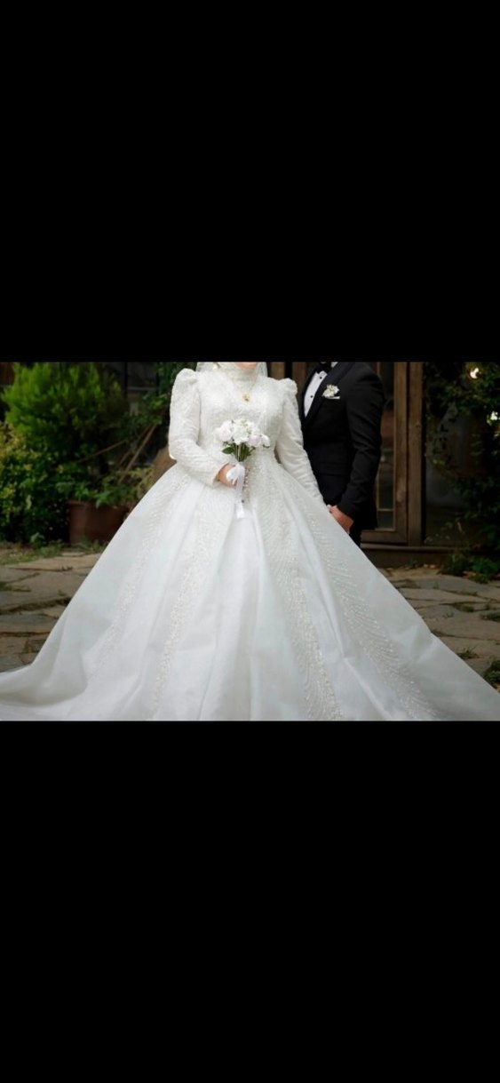 Uzun kollu, oturan kesim ve kesimli yaka detaylı beyaz prenses gelinlik, omuzları vatkalı, sadece birkaç saat giyildi tarlatan ile beraber gönderilecektir