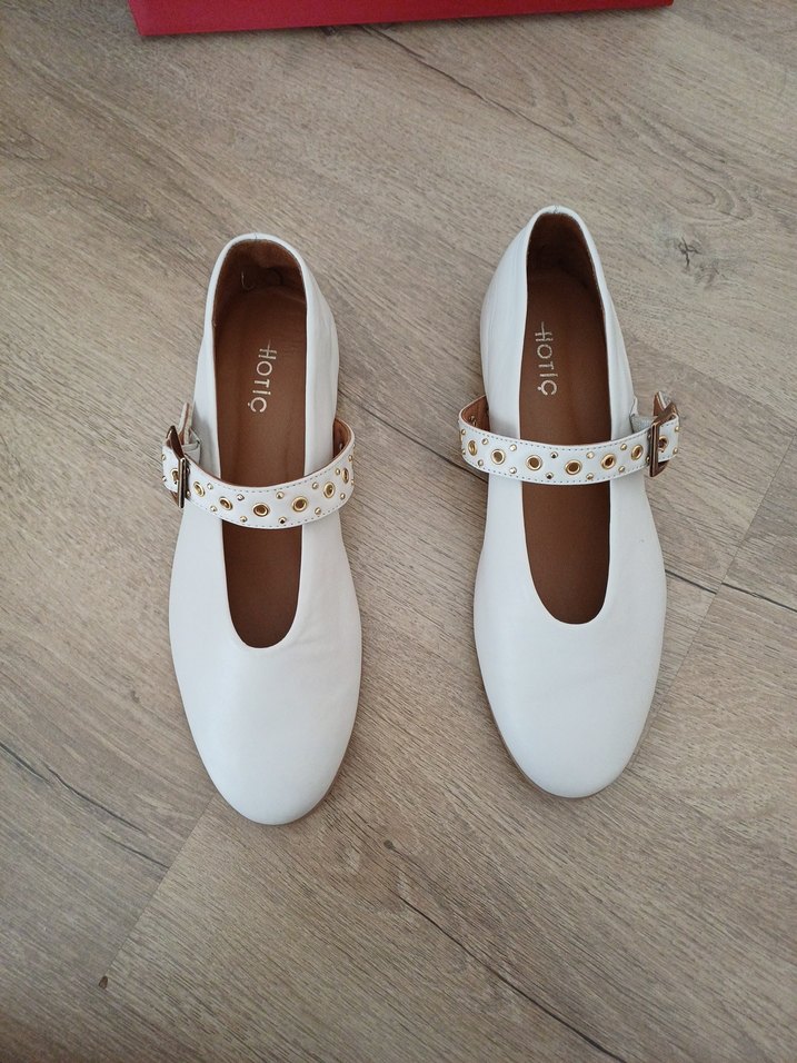 Klasik beyaz babetler, tokalı kayış ve blok topuklu tasarıma sahiptir. Dayanıklı , günlük kullanım için uygundur.