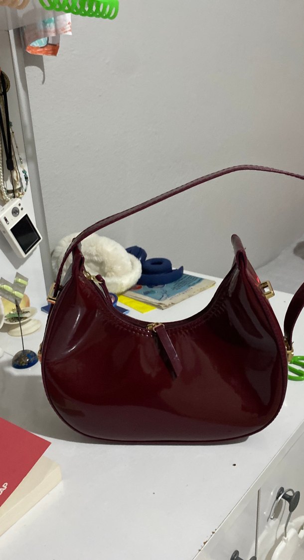 Bordo deri kadın çanta, tokalı detaylarıyla dikkat çeker. son ayarda cok da uzun degildir tam bordo rengi cig bie rengi yok trendyoldan almiştim cok kullanisli gelmedj satiyorum