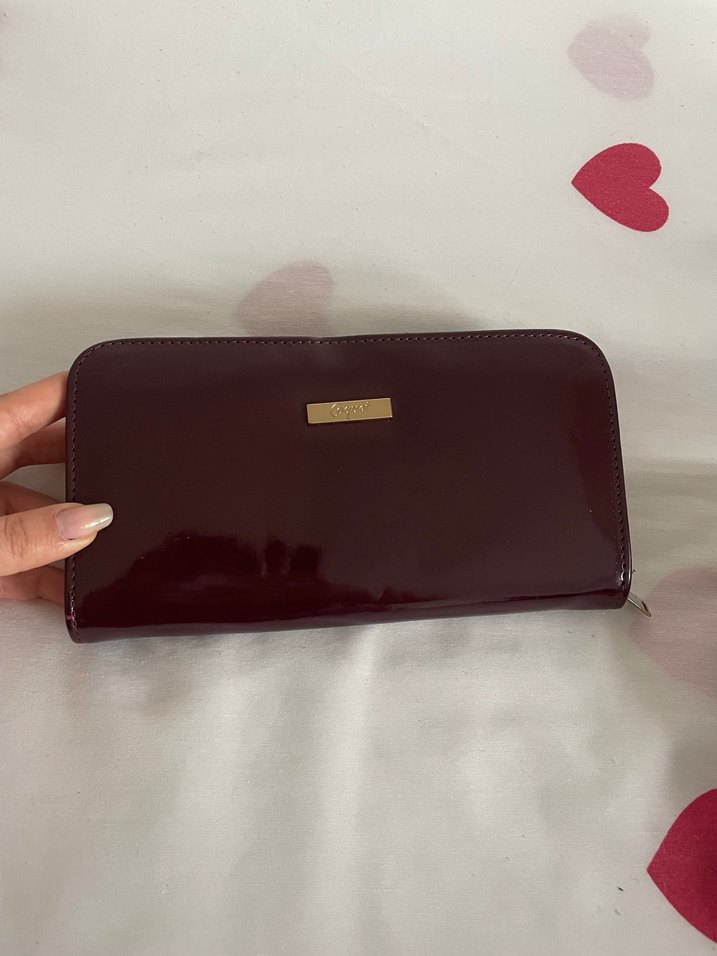 Parlak bordo deri rugan kadın cüzdan, desensiz ve modern klasik tarzda günlük kullanım için uygundur. İş hayatına uyumlu, genç ve şık bir modeldir.
