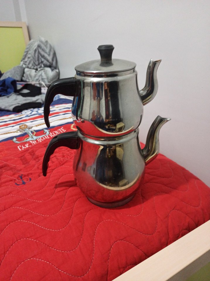 İki katlı, siyah saplı klasik çelik çaydanlık seti, çay demlemek için uygundur. Parlak yüzeyi şık bir görünüm sunar. ☕
