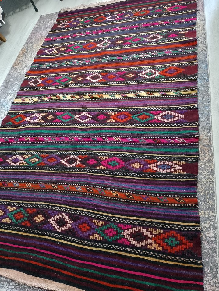 Klasik tarzda, koyu tonlarda çok renkli desenlere sahip halı, her mekâna sıcak ve sanatsal bir dokunuş katar. el dokuması otantik desenli hiç kullanılmadı ölçüleri foto yükledim bakabilirsiniz
