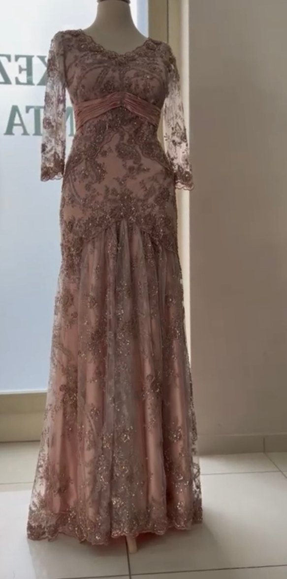 Klasik kesim, V yakalı, uzun kollu ve işlemeli detaylara sahip uzun abiye elbise, düğünler nişan söz için uygundur. Özel dikim