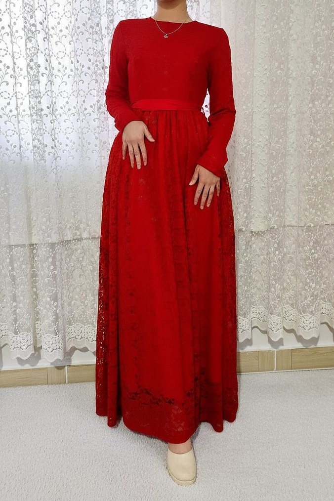 Klasik Dantelli Kırmızı Uzun Kollu Kadın Elbise
