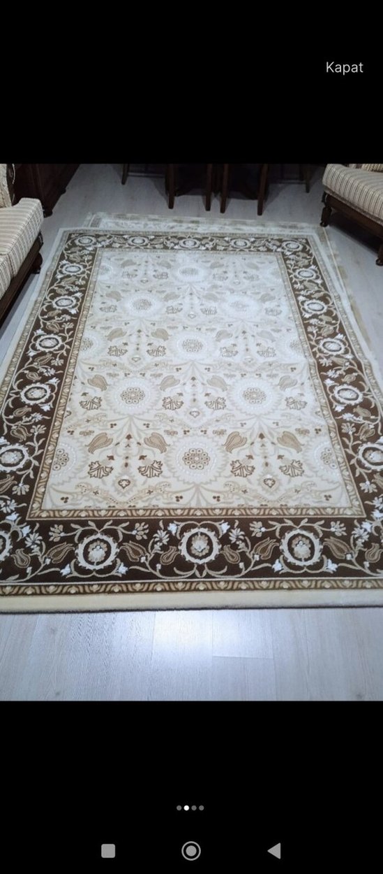 Klasik desenlere sahip açık kahverengi tonlarında dekoratif bordürlü halı, her odaya zarif bir dokunuş katar.