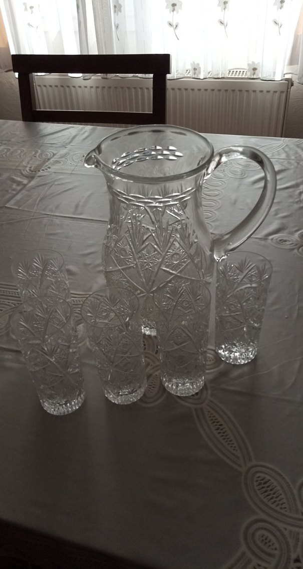 Saplı şeffaf cam sürahi ve 5adet uzun bardak, üzerinde detaylı oyma desenler bulunur. İçecek servisinde kullanılır.pazarlık payı mevcuttur