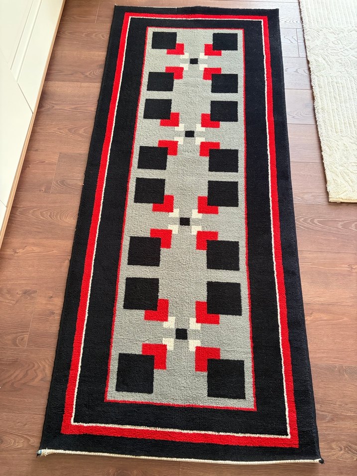 Siyah, kırmızı ve gri tonlarda desenli, koyu çok renkli klasik tarzda bir halıdır. Eni 81 cm boyu 1.93 cm dir .Yıkatılıp temizlenip kaldırılmıştır .