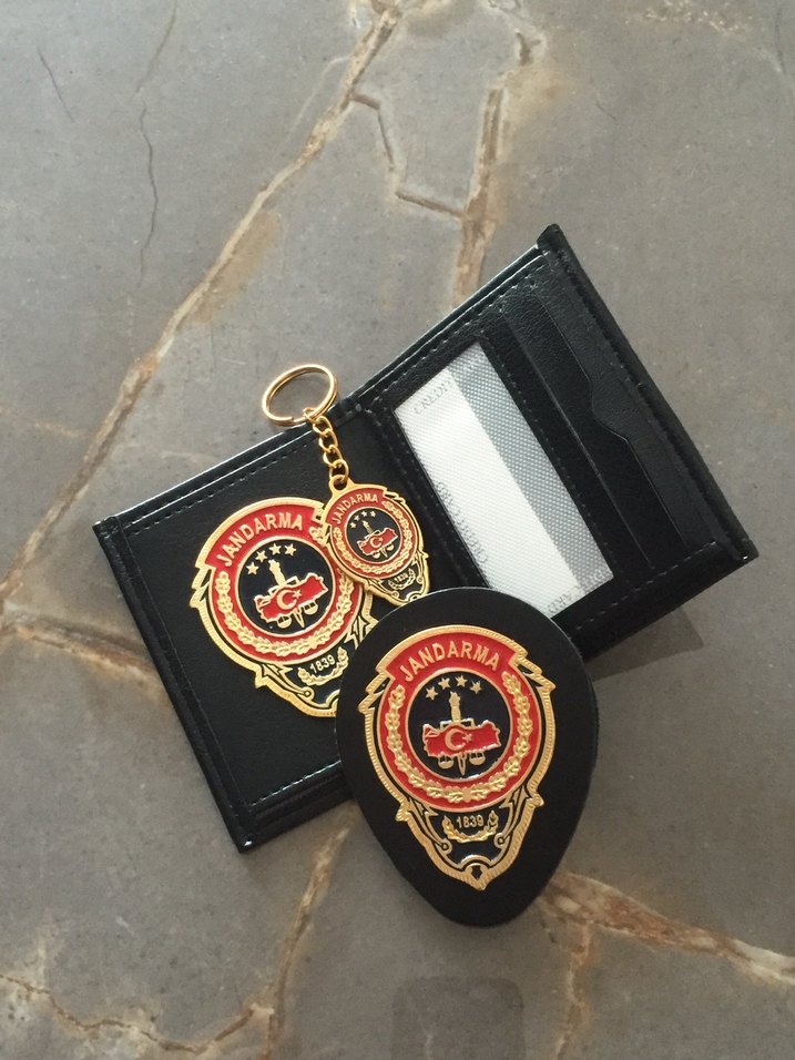 Koyu renkli, altın detaylı klasik baskılı erkek cüzdanı ve anahtarlık seti. Kart bölmeleri ve şeffaf kimlik penceresi içerir.