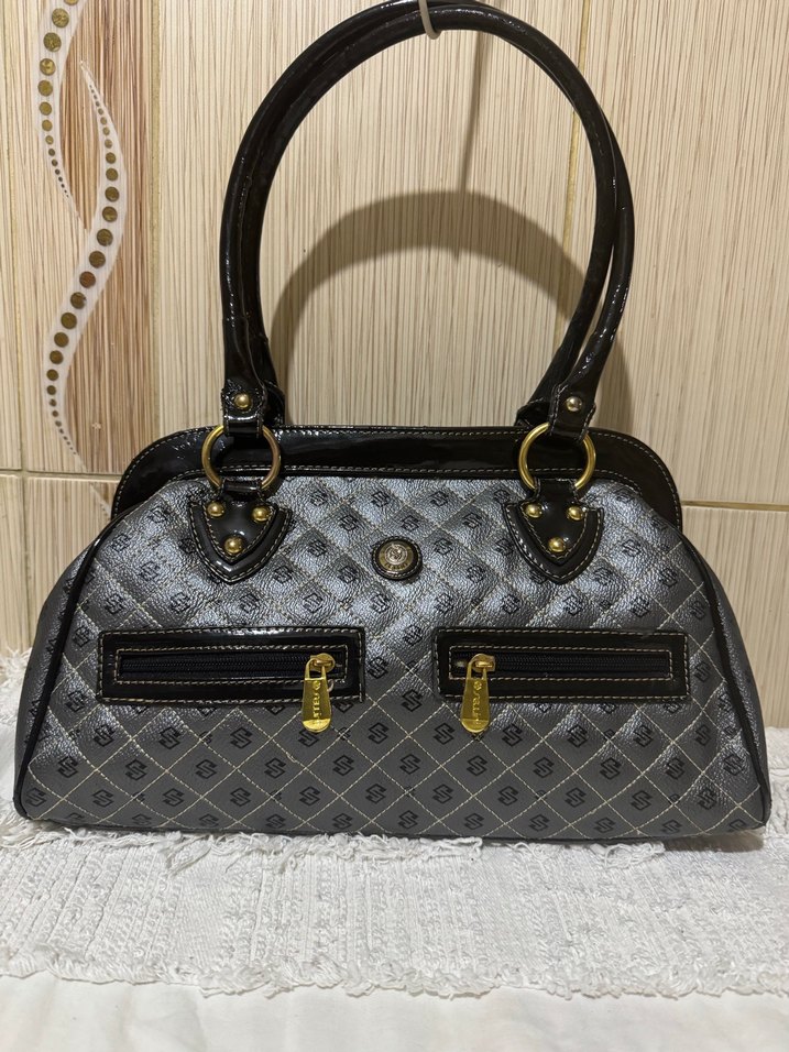 Desenli gri deri malzemeden yapılmış, tokalı siyah sapları ve altın renk fermuar detayları ile klasik ve modern tarzı bir araya getiren kadın çantası. Sellini marka önde iki cep, şerit ve kulp rugan, geri kalan pvc. İçi 2 bölme ve cepli, yarım kalıp, kulp yan şerit lastiği aşınmış. Ruganı sağlam. Kusuruna binaen uygun fiyatladım İADE ALMAYACAĞIM. 24 cm boy, 35 cm en, 16 cm yan genişlik. Taban 12 cm.