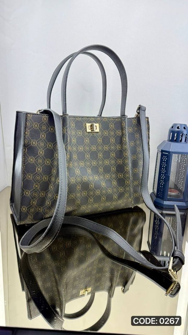 Kemerli kapama ve baskılı desenli yumuşak deriden yapılmış kadın çantası. Hem elde hem omuzda kullanılabilen askıları vardır. Gri ve kahverengi tonları modern klasik iş stiline uygundur. A++++ A kalite Ultra lüks Bby72 026