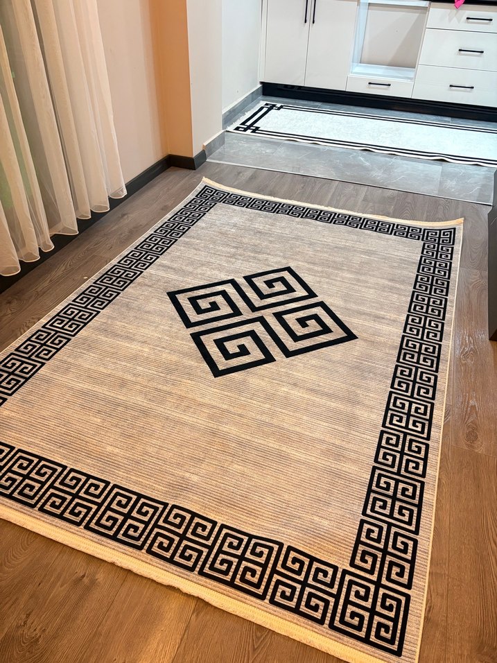 Klasik desenli, gri tonlarda baskılı halı. İç mekan kullanımı için yumuşak dokulu bir seçenektir.