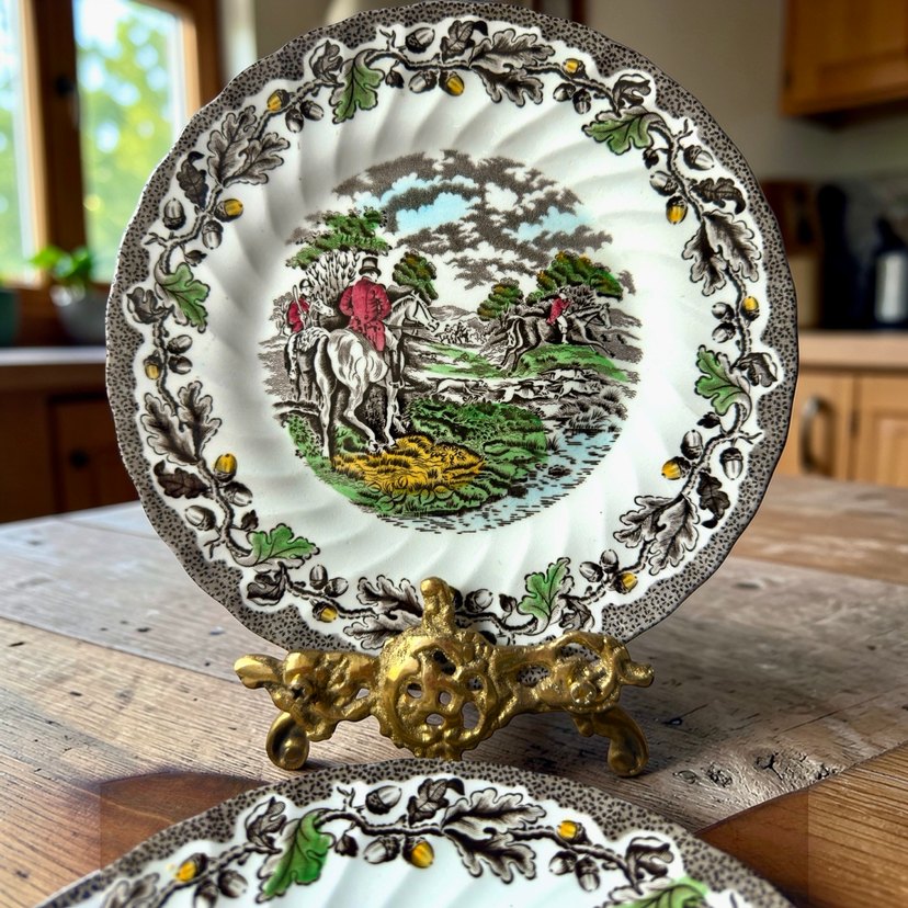 Myott’s “Country Life” – Staffordshire / England 2 adet Gerçek bir İngiliz country ruhu ✨ Merkezde klasik av sahnesi, çevresinde meşe yaprakları ve palamut bordürüyle zamansız bir tasarım. • 20 cm • Staffordshire ware • Made in England • Koleksiyonluk seri Hem dekoratif kullanım hem de servis tabağı olarak değerlendirilebilir. Country, cottagecore, rustik masa düzenleri için şahane bir tamamlayıcı
