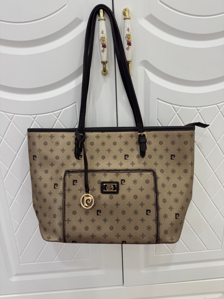 Kahverengi deri çanta, baskılı deseni ve fermuarlı tasarımıyla modern klasik stilde, Paris şıklığını yansıtır.