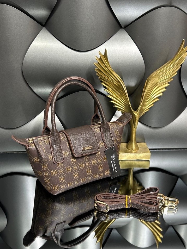 Kahverengi deri kadın çanta, parlak desenli baskıya ve tokalı kapak detayına sahiptir. Çıkarılabilir askısı ile modern klasik tarzda günlük kullanım için uygundur.
