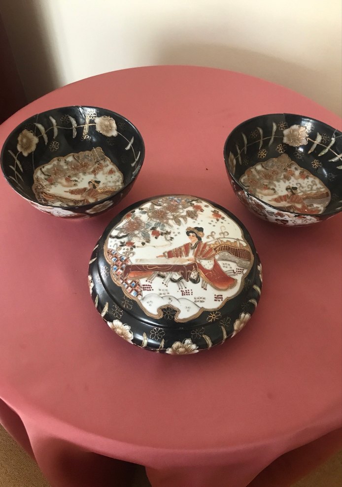 Koyu kırmızı ve siyah renklerde, çiçek desenli klasik motiflerle süslenmiş iki kase ve bir tabaktan oluşan set. Kaselerde sorun var