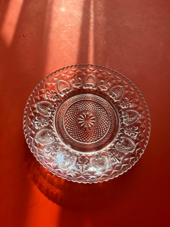 Soyut desenli klasik tarzda cam tabak, canlı kırmızı zemin üzerinde yer alıyor. Detaylı desenlere ve ışık yansımalarına sahip. ️
