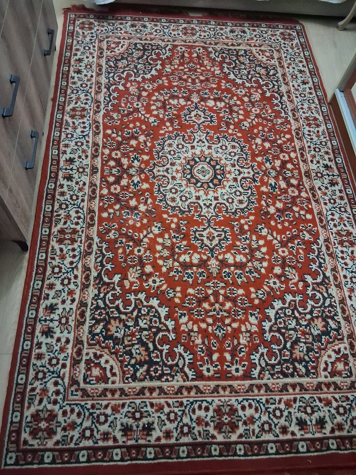 Koyu kırmızı zemin üzerine beyaz ve siyah detaylarla klasik desenlere sahip vintage halı 1.50×260 cm..