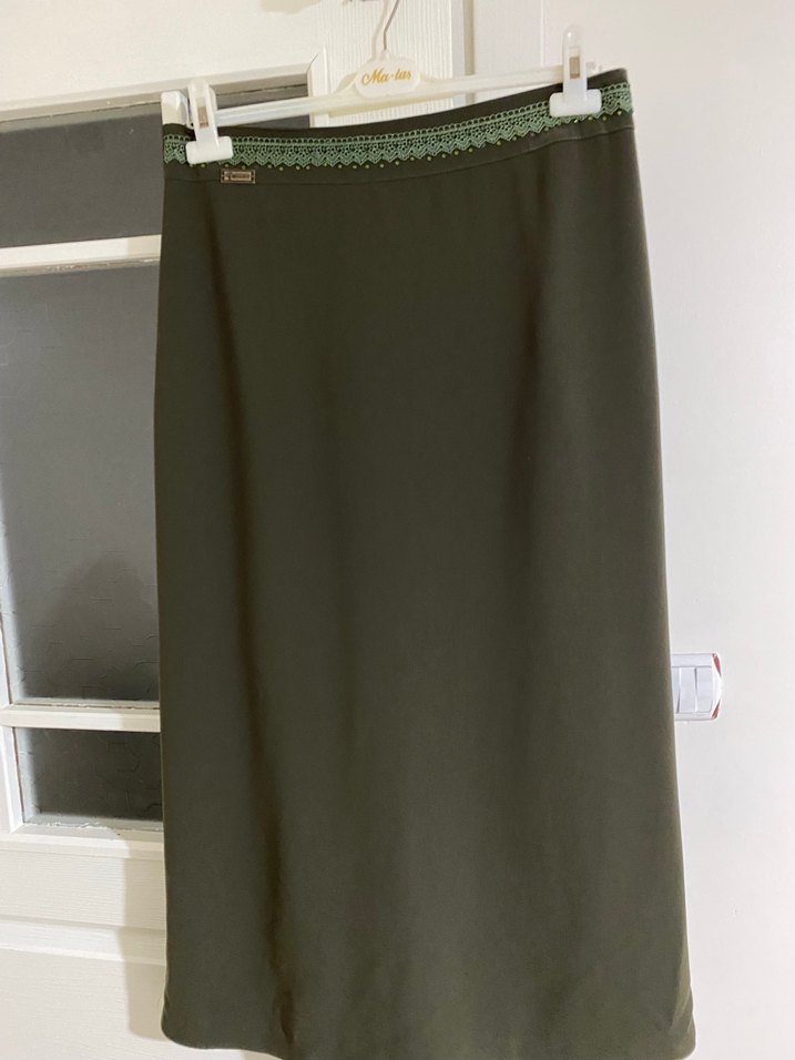 Dökümlü tasarıma sahip, koyu yeşil uzun etek. Düz kesim ve sentetik kumaştan, ofis için uygun.