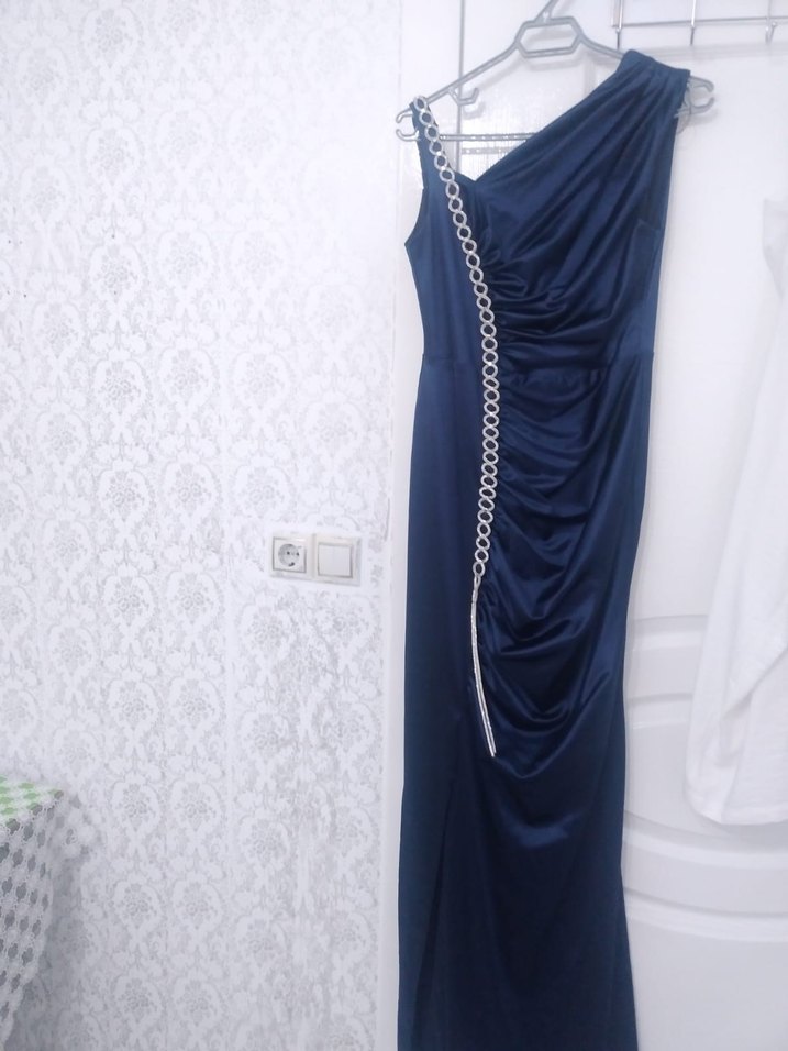 Lacivert uzun abiye elbise, drapeli ve straplez yakalı, klasik ve modern dokunuşlar taşıyor. Parlak kumaşı düğünler için uygun şıklık sunar.