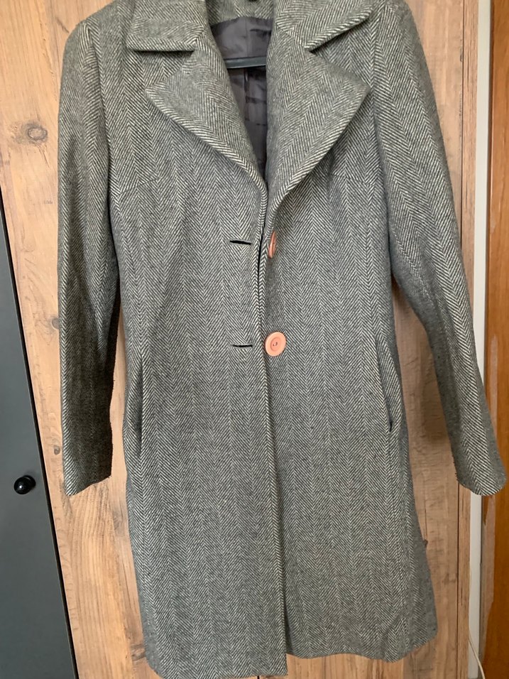 Klasik düğmeli ve balıksırtı desenli kadın patdesü, yumuşak iç astar ve yan cepler içerir. İç astatım bazı yerlerinde ufak tefek sökülmeler olsada çok iyi durumda ancak askıda çok beklediği için kuru temizleme gerekli