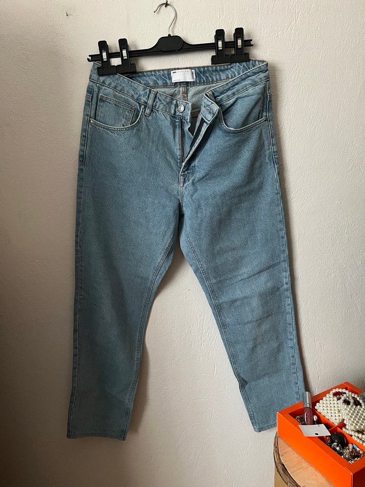 Denim, gri-mavi renkte, düz kesim ve tokalı detaylı kadın kot pantolon. Günlük kullanıma uygun, desen içermeyen rahat bir modeldir. Çok az giyildi fotoğrafı gayet detaylı gözüküyor her şey ☺️