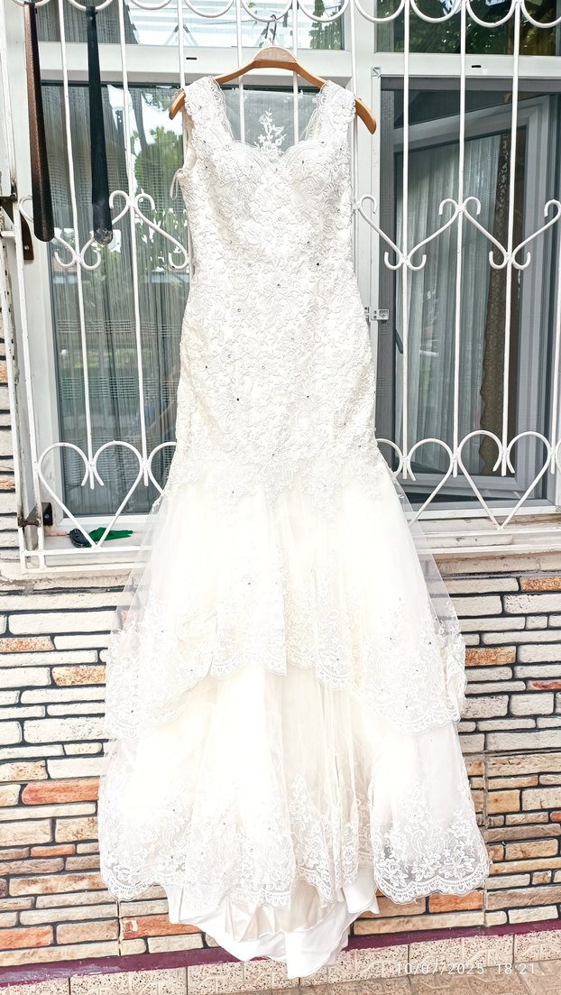 Uzun boy, askısız ve kolsuz, balık model klasik elegan beyaz gelinlik. Hafif beyaz renkte, göz alıcı dantel detaylara sahip. alt etek altı kasnak demirleri de var açılıyor güzel model