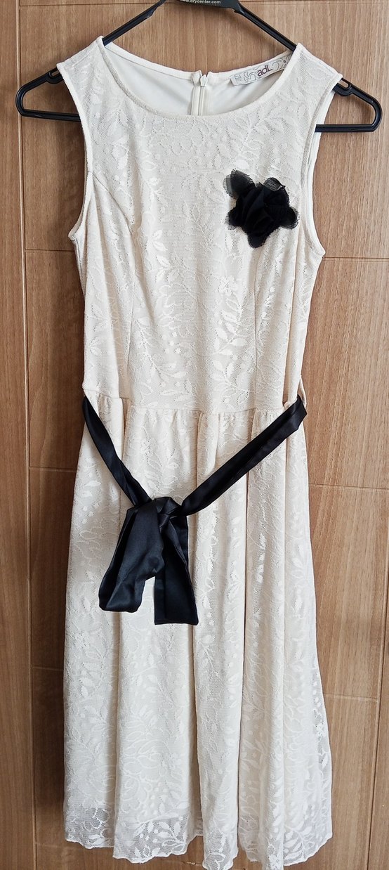 Askısız yaka, siyah kuşak ve çiçek detaylı beyaz midi elbise. Vintage tarzda, klasik ve şık, düğünler için uygun.