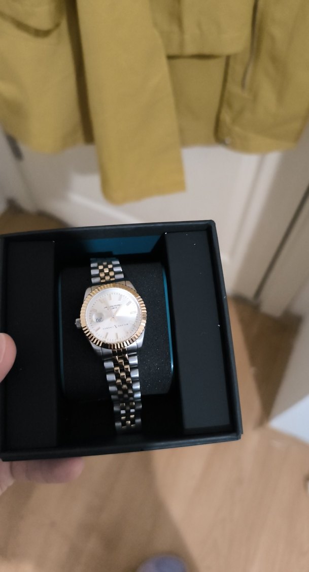 Bu kadın saati, altın ve gri renkli, tokalı bilezikle modern klasik tasarıma sahip, şıklığı ve iş stilini bir arada sunuyor. ⌚ orjinal saat saatten alındı garantisi mevcut