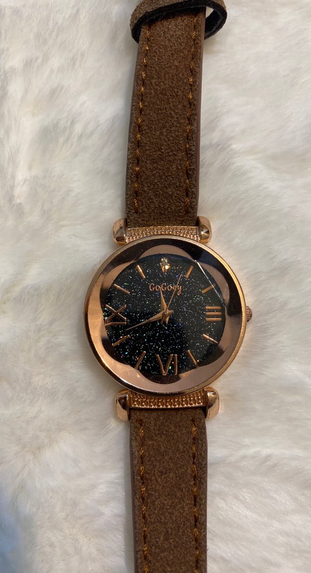 Koyu kahverengi kayışlı, tokalı kadın saati. Siyah ışıltılı kadranı ve Roma rakamlarıyla modern klasik tarzda.pil tok