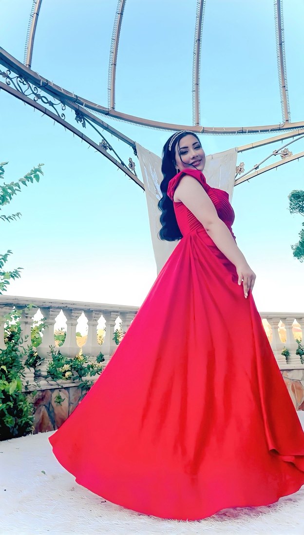 Askılı, kolsuz kırmızı abiye elbise drapeli tasarıma ve parlak görünüme sahiptir. Düğünler için uygun, modern klasik tarzda ve klasik elegan duruşa sahiptir. Desensizdir.