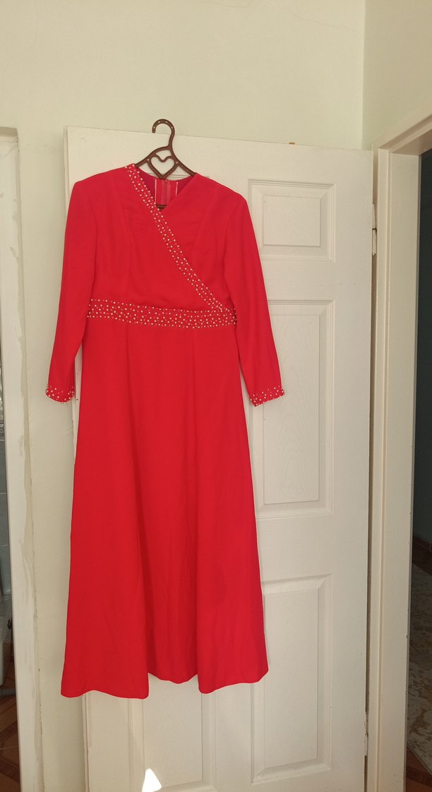 Kırmızı parlak renkte, satenimsi kumaştan yapılmış, V yakalı, drapeli, uzun kollu ve beli işlemeli klasik vintage tarzda uzun kadın elbisesi. ÖZEL DİKİM BEDENİ BELLİ DEĞİL TAHMİNİ 42 BEDEN