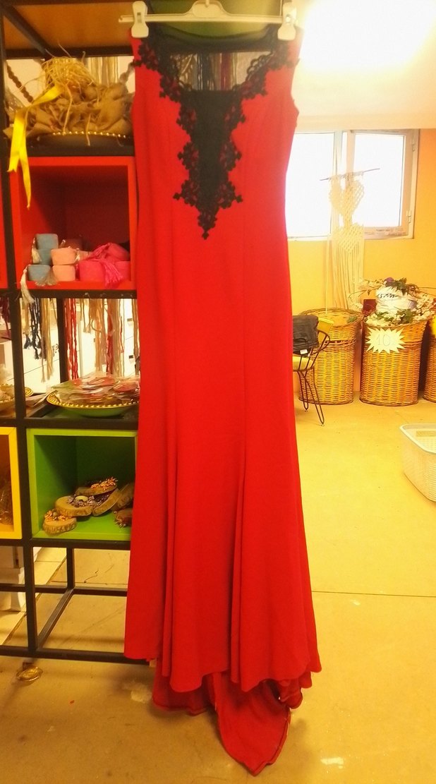 Klasik elegan tarzda, dar kesim ve kolsuz kırmızı uzun elbise, drapeli ve koyu desenli V yaka detaylı, gotik düğünler için uygun.