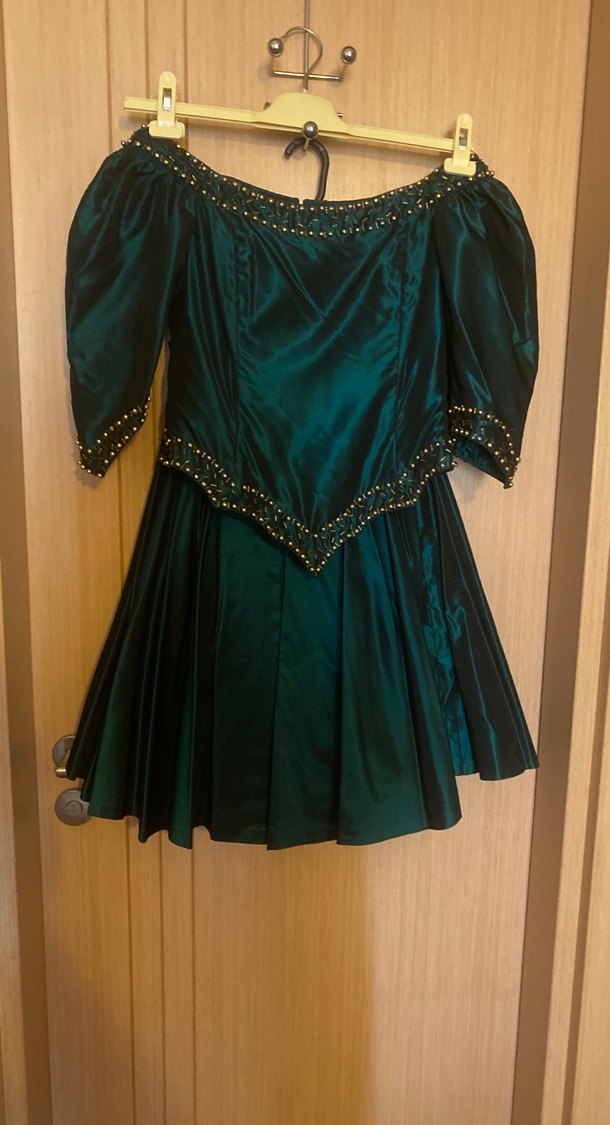 Turkuaz renkli, drapeli ve kapri kollu, omuzlar açık abiye, tekne yaka ve oturan kesimiyle klasik elegans sunar. Parlak kumaş ve boncuk detayları vintage gotik tarzı yansıtır. ✨ Ördekbaşı yeşil renk, tafta kumaş Nişan için özel bir butiğe diktirildi, sadece iki kez giyildi