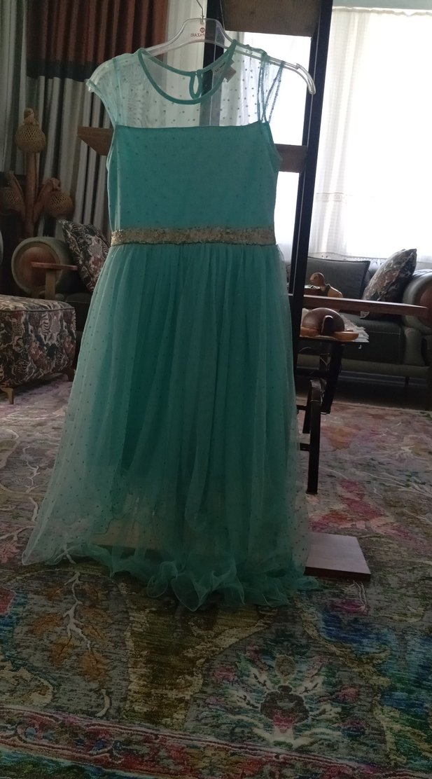 Turkuaz renkli, straplez yaka ve askılı kolları olan, parlak sentetik kumaştan yapılmış, drapeli, bohem tarzda klasik elegans kız elbisesi.