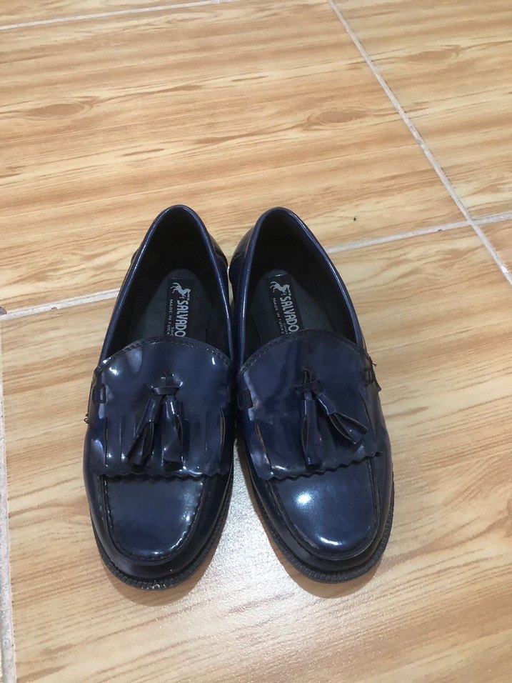 Lacivert renkli, püsküllü, lastik malzemeden yapılmış, klasik ve geleneksel tarzda erkek çocuk loafer ayakkabı.