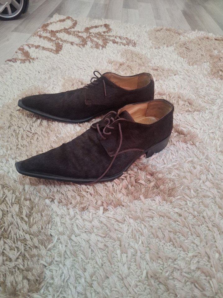Koyu kahverengi süet erkek klasik ayakkabılar, kürk detaylıdır. Ofis kullanımı için uygun, şık ve desen içermeyen modern tasarıma sahiptir.