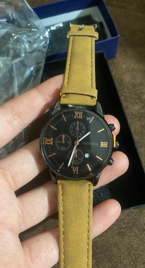 Kahverengi deri kayışlı klasik erkek saati. Roma rakamları ve ek küçük kadranlar bulunur. Geneva marka. ⌚