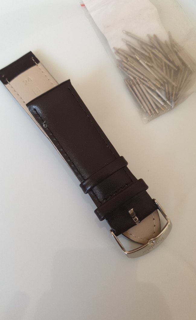 Erkek saat kayışı, koyu renkli biker tarzı dış yüzey ve yumuşak bej iç yüzeye sahiptir. Metal tokası ve ek pinleriyle birlikte gelir. ⌚