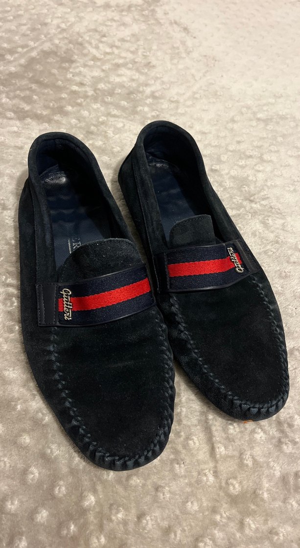 Koyu renk süet malzemeden yapılmış, kırmızı-siyah tokalı klasik erkek loafer ayakkabı. Günlük kullanıma uygun.