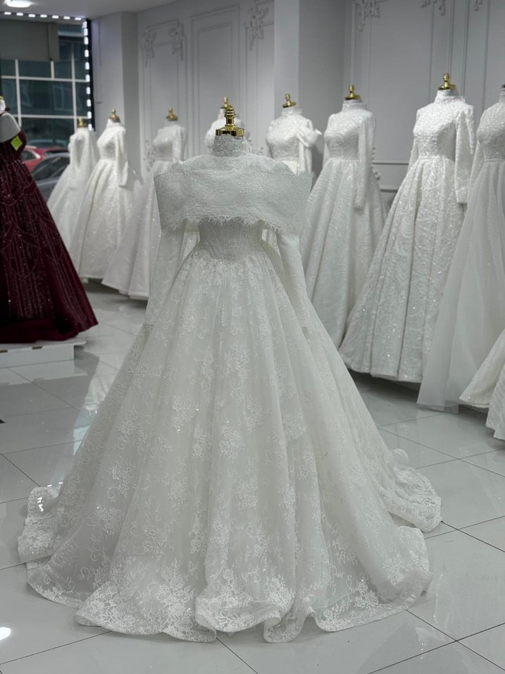 Bu beyaz prenses gelinlik, straplez yaka ve uzun, bol kesim siluete sahiptir. İnce dantel kumaştan yapılmış olup, düğünler için klasik ve göz alıcı bir şıklık sunar. Kolsuz tasarımı geleneksel tarzını vurgular.